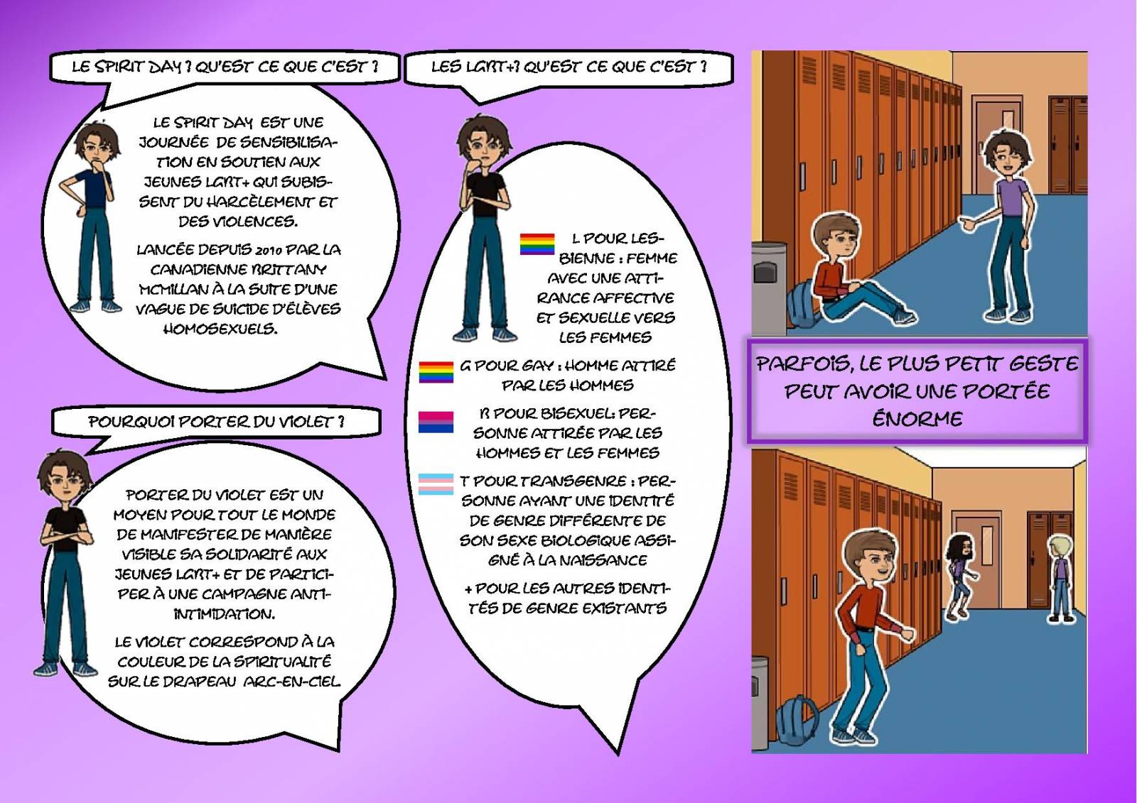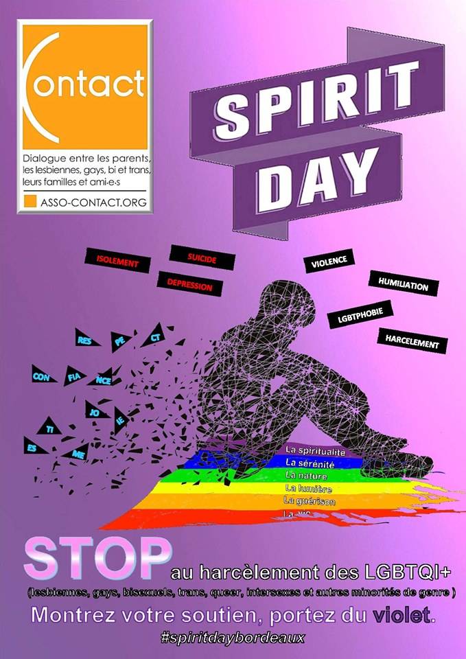 A l'IFP Bordeaux, tout le monde à sa place sauf les discriminations ! Nous nous joignons à l'association Contact Aquitaine pour une nouvelle édition du Spirit Day. Le Spirit Day est un mouvement canadien pour lutter contre les discriminations liées à l'orientation sexuelle et au genre. Durant le mois d'Octobre, chaque promo portera la couleur violette (bracelets, t-shirt, ou tout ce que vous voulez !) L'idée est de montrer notre soutien aux personnes victimes de harcèlement en milieu scolaire et de sensibiliser nos étudiants à la tolérance ! #onnelacherien